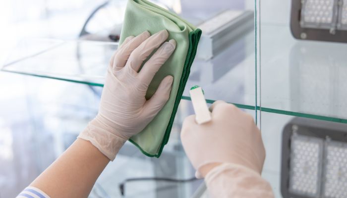 Sanitized workstations, door handles, and common areas.